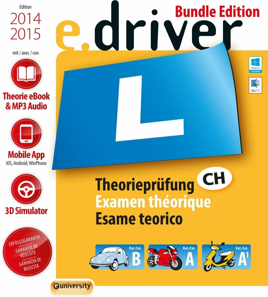 e.driver 2014/2015: Ist in den Sprachen Deutsch, Französisch und Italienisch, zur Vorbereitung auf die Theorieprüfung für Motorfahrzeugführer Kat. A1, Kat. B und Kat. A, verfügbar. Als erstes und einziges Lernprogramm für die Theorieprüfung umfasst es die drei Komponenten Hören, Sehen und praktische Anwendung.