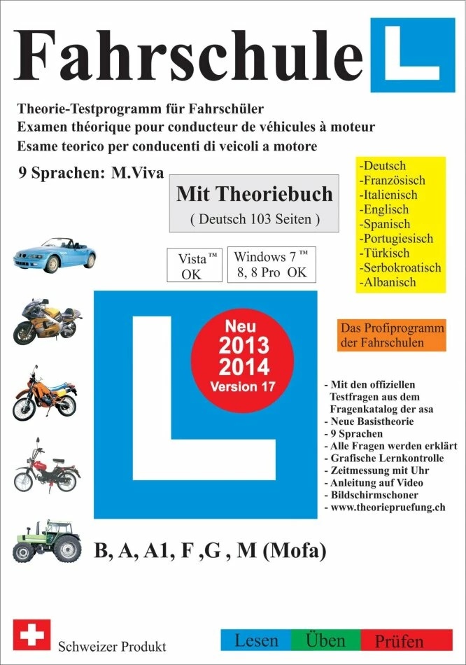 Mit diesem Computer-Programm für PC mit Windows (R) 95 , 98, Me ,NT,2000, Xp,Vista kann der interessierte Fahrschüler seine theoretische Kenntnisse testen , auffrischen, und neu lernen. Sie haben alle original Fragen.