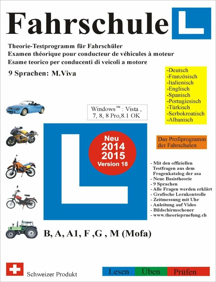 Mit diesem Computer-Programm für PC mit Windows (R) 95 , 98, Me ,NT,2000, Xp,Vista ,7,8,8Pro,8.1 kann der interessierte Fahrschüler seine theoretische Kenntnisse testen , auffrischen, und neu lernen. Sie haben die offiziellen original Fragen der ASA . (Bilder,Textfragen,Zeichnungen,Fotos)