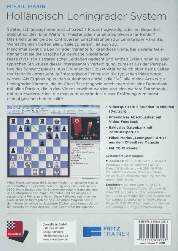 Strategisch gewagt oder aussichtsreich? Etwas fragwürdig oder, im Gegenteil, absolut solide? Eine Waffe für Meister oder nur eine Spielwiese für Kinder? Das sind nur einige der kontroversen Einschätzungen zur Leningrader Variante. Wahrscheinlich treffen alle Urteile zu einem Teil auch zu. Manchmal sorgt die Leningrader Variante für grandiose Siege, bei anderer Gelegenheit ist sie die Ursache für peinliche Niederlagen. Diese DVD ist als strategischer Leitfaden gedacht und enthält Erklärungen zu allen typischen Strukturen dieser interessanten Verteidigung, zumeist aus der Perspektive des Schwarzspielers. Aus Gründen der Objektivität habe ich aber beide Seiten der Medaille untersucht, auf strategische Fehler und die typischen Pläne hingewiesen. Als Ergänzung zu den Aufnahmen enthält die DVD alle meine Artikel zur Leningrader Variante, die im ChessBase Magazin erschienen sind, eine Datenbank mit allen Partien, die in den Videos erwähnt werden und eine weitere Datenbank, mit den Musterpartien, die man zum Verständnis dieser Eröffnung zumindest einmal gesehen haben sollte.