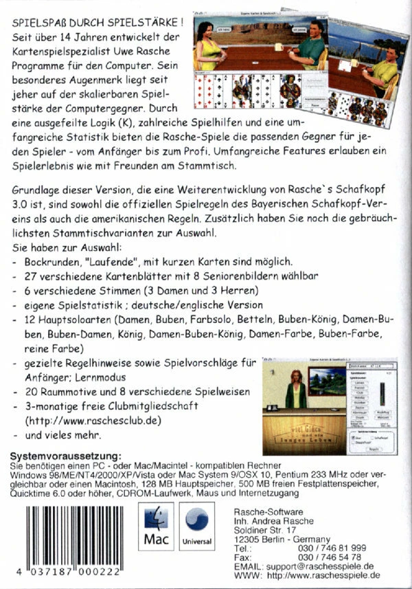 Grundlage dieser Version, die eine Weiterentwicklung von Rasche`s Schafkopf 3.0 ist, sind sowohl die offiziellen Spielregeln des Bayerischen Schafkopf-Vereins als auch die amerikanischen Regeln. Zusätzlich haben Sie noch die gebräuchlichsten Stammtischvarianten zur Auswahl.