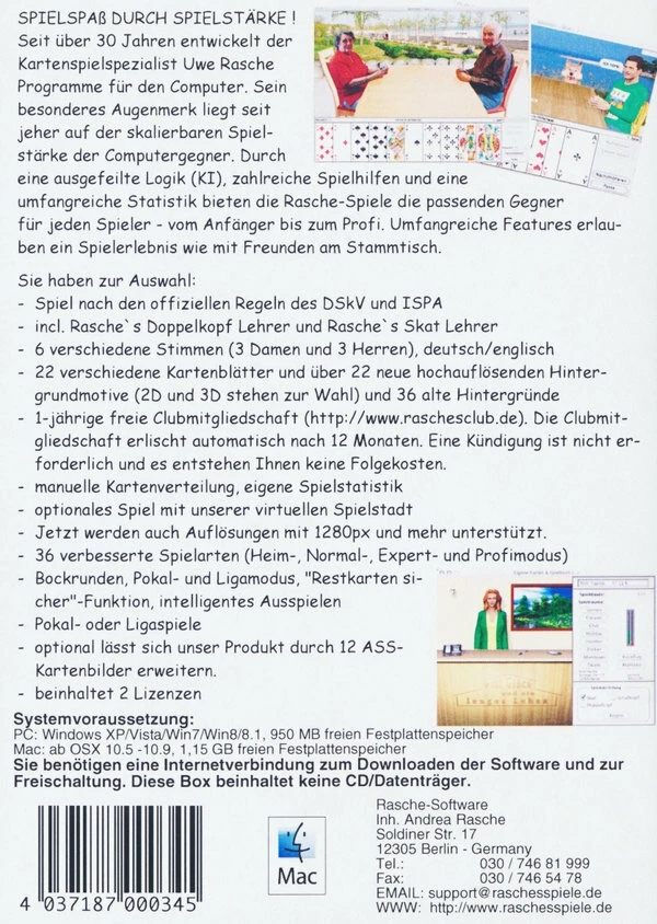 SPIELSPAss DURCH SPIELSTÄRKE ! Seit über 30 Jahren entwickelt der Kartenspielspezialist Uwe Rasche Kartenprogramme für PC und Mac. Sein besonderes Augenmerk liegt seit jeher auf der skalierbaren Spielstärke der Computergegner. Durch eine ausgefeilte Logik (KI), zahlreiche Spielhilfen und eine umfangreiche Statistik bieten die Rasche-Spiele die passenden Gegner für jeden Spieler – vom Anfänger bis zum Profi. Umfangreiche Features erlauben Ihnen ein Spielerlebnis wie mit Freunden am Stammtisch.